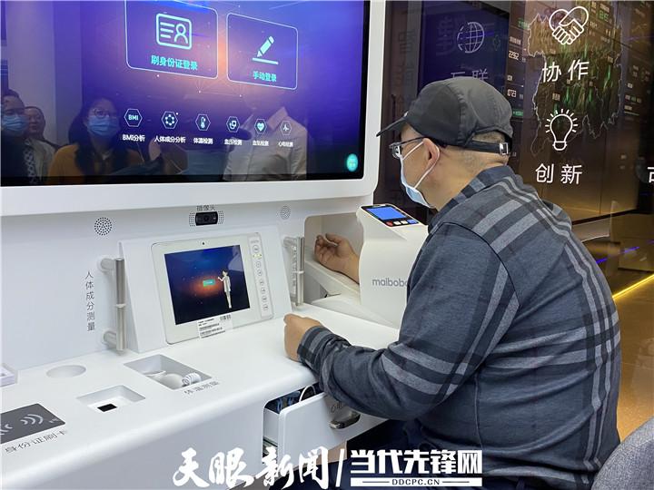 一名參觀者正在展廳內的健康微診室使用智能測壓儀測量血壓