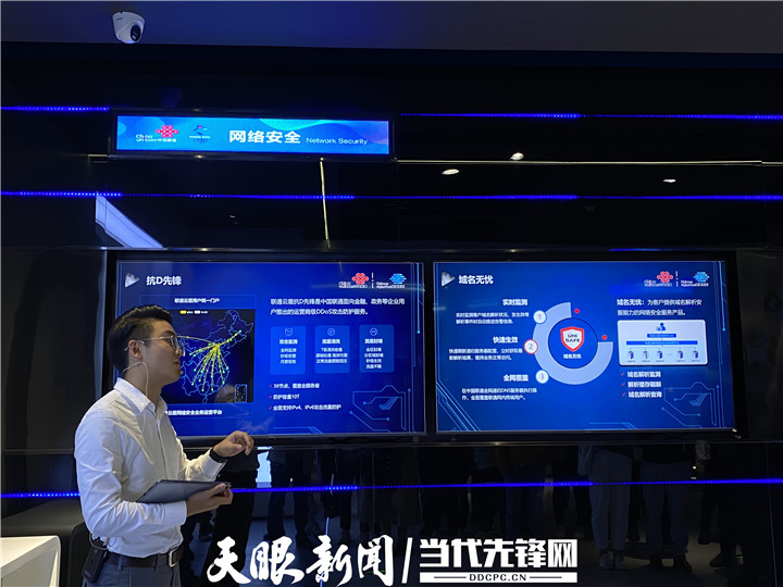 在網絡安全版塊,講解員為大家介紹了“抗D先鋒”“域名無憂”兩個亮點項目。聯通云盾抗D先鋒是中國聯通面向金融,政務等企業用戶推出的運營商級DDoS攻擊防護服務,目前已覆蓋全國各省。據了解,在網絡安全方面,聯通省公司安全運營平臺對客戶上網流 量進行統的管控、 審計、分析,并能針對上網流量進行安全查殺與防護,在安全的情況下實現為客戶代理上網,從而保障了客戶上網的安全與行為管控。