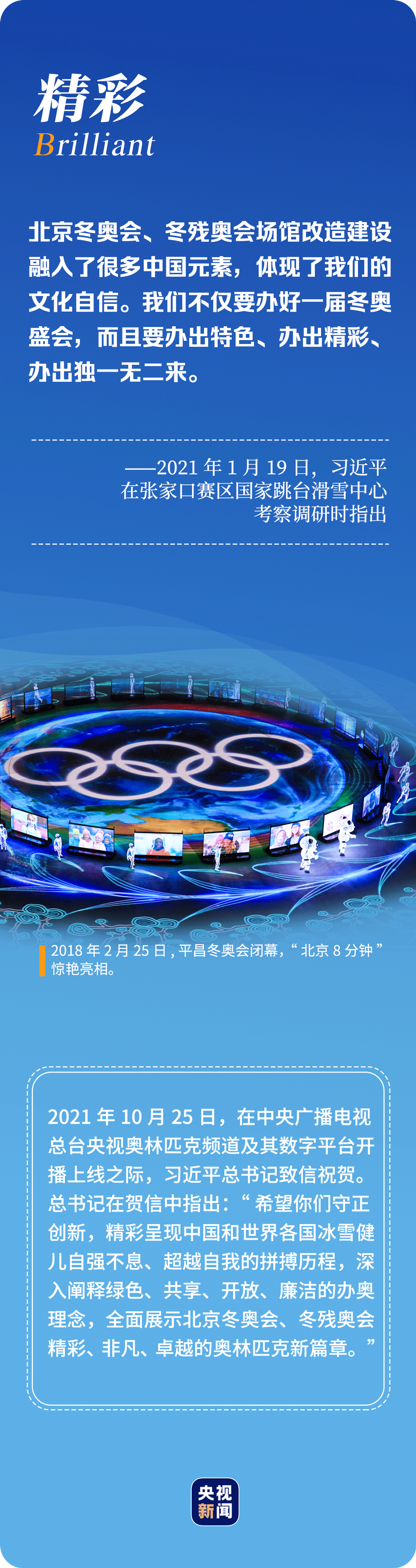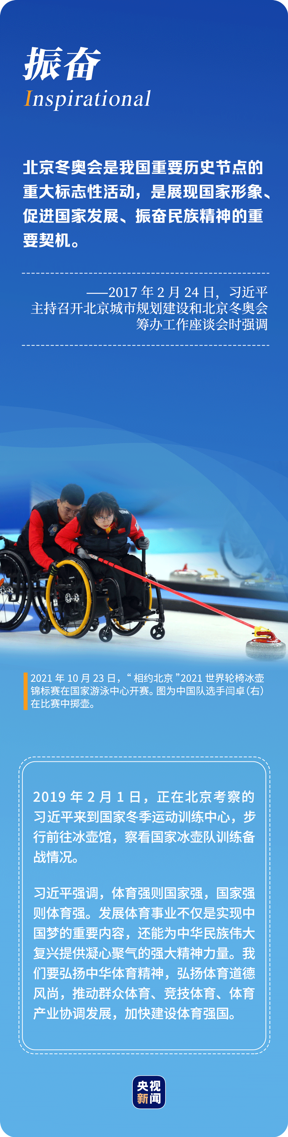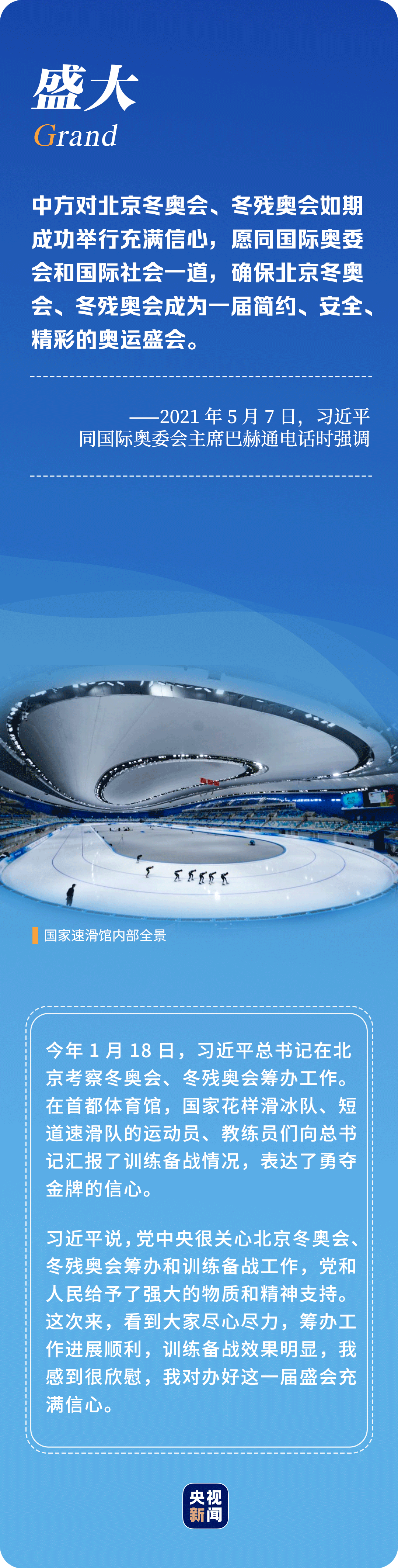 “辦好北京冬奧會、冬殘奧會是黨和國家的一件大事,是我們對國際社會的莊嚴承諾,做好北京冬奧會、冬殘奧會籌辦工作使命光榮、意義重大?!?年多來,習近平總書記始終惦記著冬奧會籌辦進展,多次實地考察、主持召開重要會議部署推進冬奧籌辦工作。