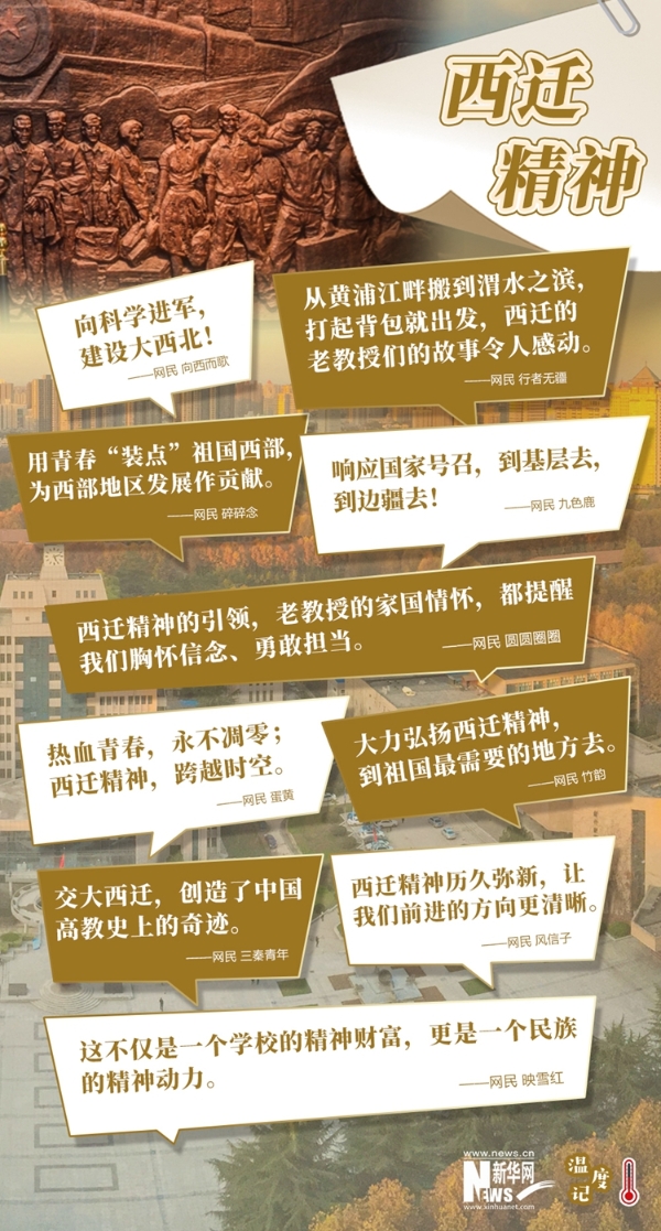 “西遷精神歷久彌新,讓我們前進的方向更清晰?!薄拔鬟w精神的引領,老教授的家國情懷,都提醒我們胸懷信念、勇敢擔當?!薄瓘木W民們的留言中,我們讀出了一種精神的寶貴和傳承。到黨和國家最需要的地方去!今天,越來越多當代青年人接過歷史的接力棒,主動選擇到基層去、到邊疆去,為西部發展、國家建設貢獻智慧和力量,用實際行動譜寫著一個又一個新時代的西遷故事。(文字:董璐 海報設計:王曄)