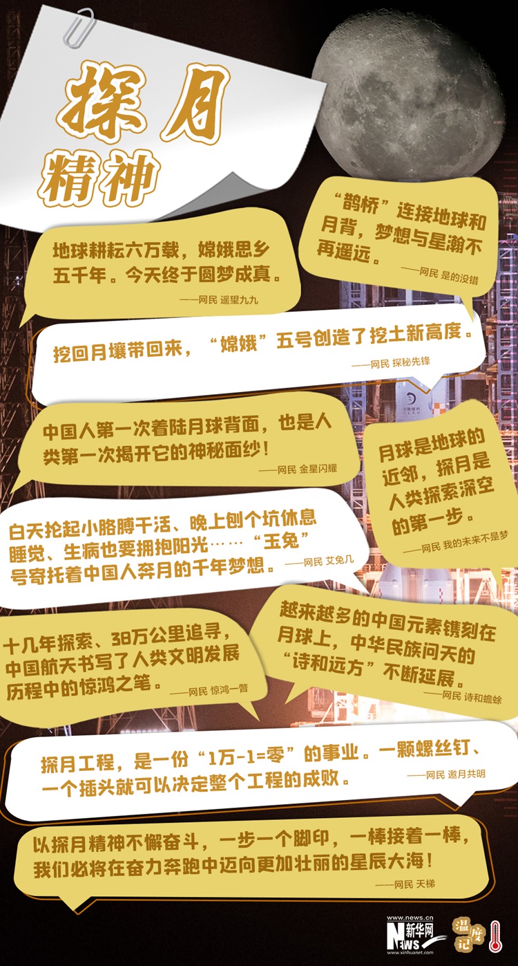 探索月球是一份“1萬-1=零”的事業,伴隨著風險、挑戰和未知,一顆螺絲釘、一個插頭甚至就可以決定整個工程的成敗。十幾年的探索,38萬公里的追尋,上百家單位、幾萬名科技工作者、解放軍指戰員用心血和智慧實現了九天攬月的一次次突破、一步步跨越,也凝結了追逐夢想、勇于探索、協同攻堅、合作共贏的探月精神。