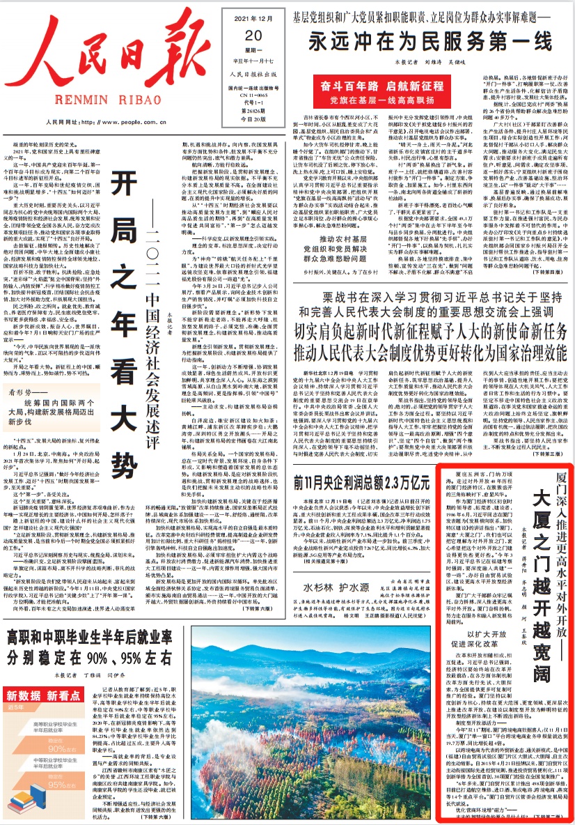 12月20日,《人民日報》頭版刊發長篇通訊《廈門深入推進更高水平對外開放——大廈之門越開越寬闊》,聚焦廈門經濟特區建設40周年,點贊廈門以擴大開放促進深化改革、以更高水平開放推動經濟社會高質量發展、以更高水平開放服務和融入構建新發展格局。