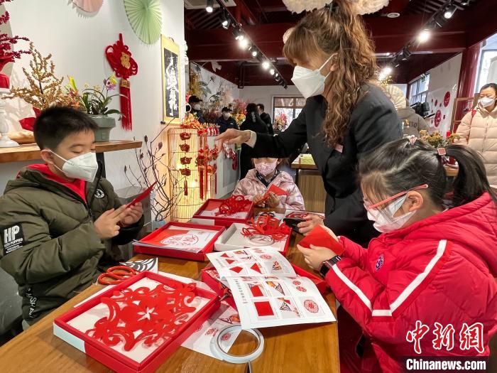 圖為小游客在北京陶然亭公園剪窗花?!”本┦泄珗@管理中心供圖