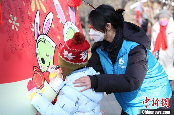 在景山公園萬春亭,游客在福條、福牌上書寫新春寄語,討個好彩頭;國家植物園東南門植物文創店里,猜燈謎、送對聯的新春祝?;顒诱诨馃徇M行中,節日期間還將有巧手制燈籠等民俗活動;北京動物園在正門廣場開展“玉兔呈祥新春送?!被顒?,抽取幸運家庭,為游客送上新春祝福并發放新年禮物;陶然亭公園不僅有剪窗花的現場體驗活動,同時在冰雪活動現場還有手寫福字、贈送小兔子掛件等年味兒十足的民俗活動,邀請游客將滿滿的福氣帶回家。