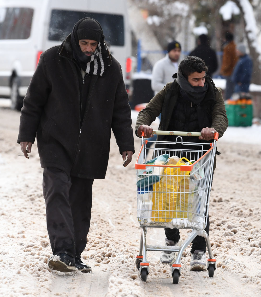 2月7日,在埃爾比斯坦地區,當地居民在街頭運輸物資。