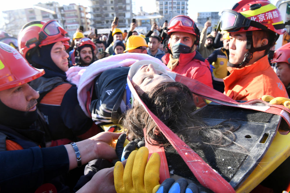2月9日,在安塔基亞市,中國救援隊與土耳其救援隊轉移一名救出的幸存者。