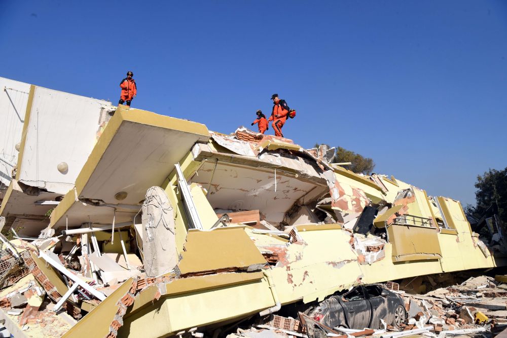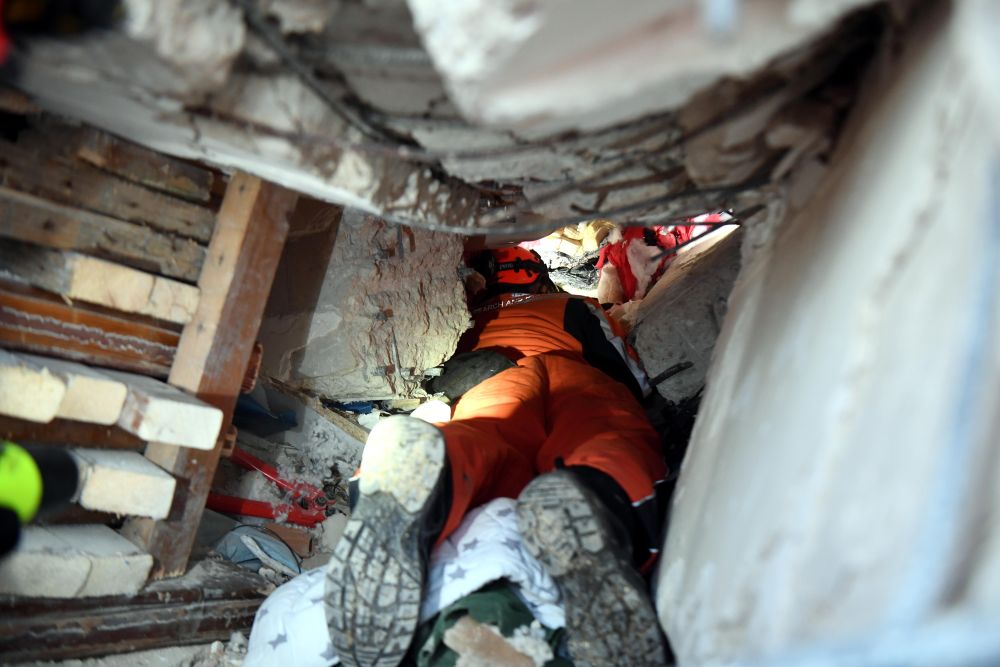 2月7日,在埃爾比斯坦地區,救援人員在一處地震廢墟搜救。