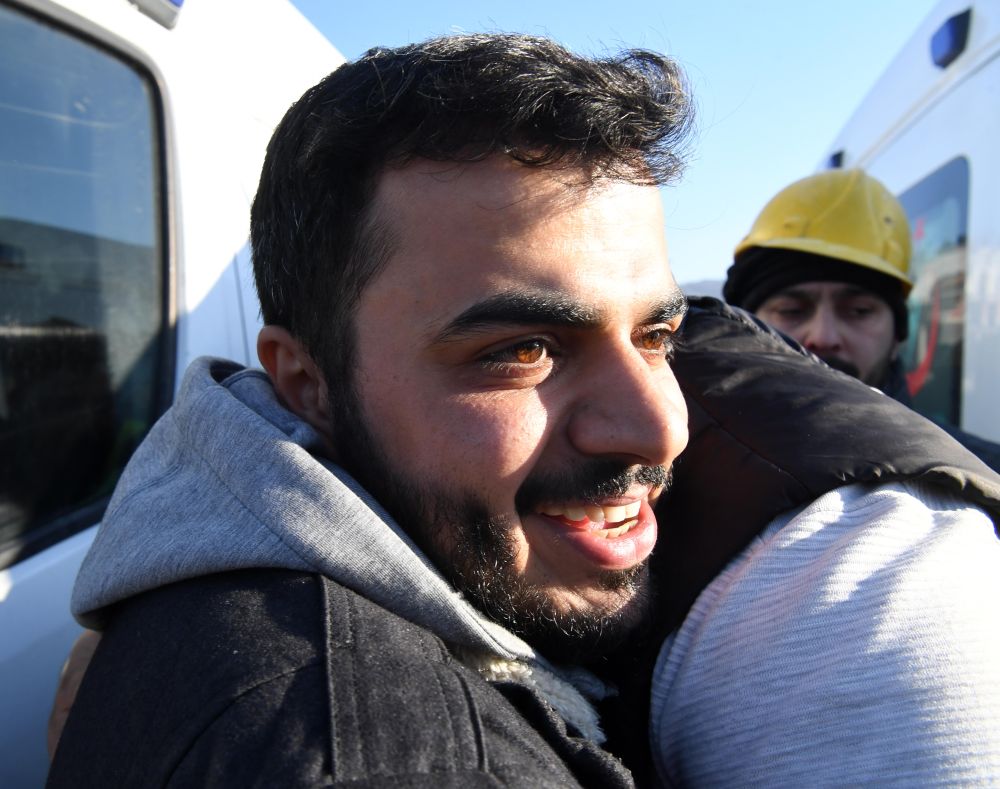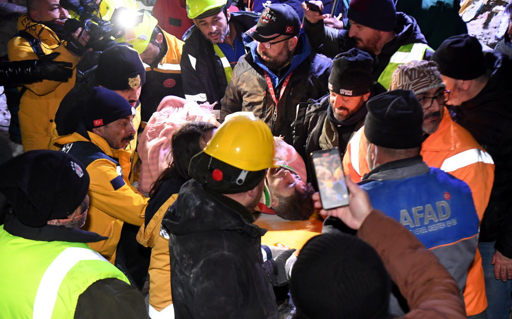 2月9日,中土救援隊聯手在安塔基亞市救出兩名幸存者后,獲救幸存者的親人擁抱致意。