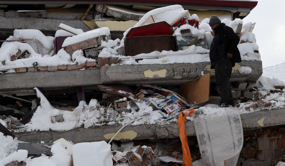 2月7日,在埃爾比斯坦地區,一名男子在地震中受損的建筑物中搜尋親人。