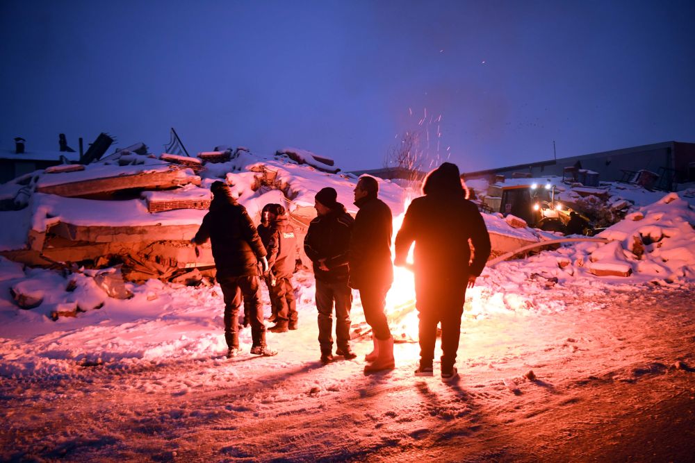 2月7日晚,在埃爾比斯坦地區,救援人員在廢墟旁燒火取暖。