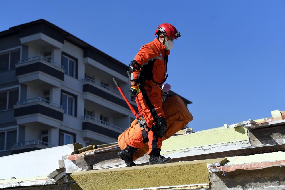 2月8日,中國救援隊隊員在哈塔伊的一處地震廢墟搜救。