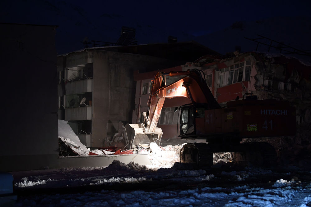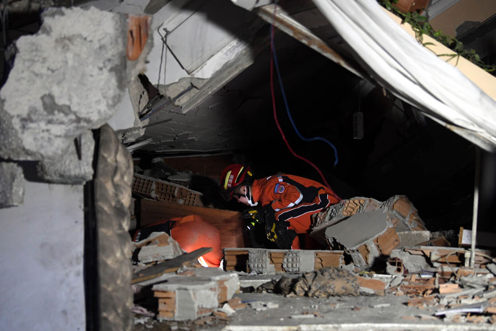 2月7日晚,在埃爾比斯坦地區,救援人員在一處地震廢墟搜救。
