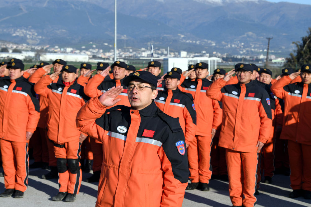 2月10日,中國救援隊隊員在安塔基亞市的駐扎營區參加升旗儀式。