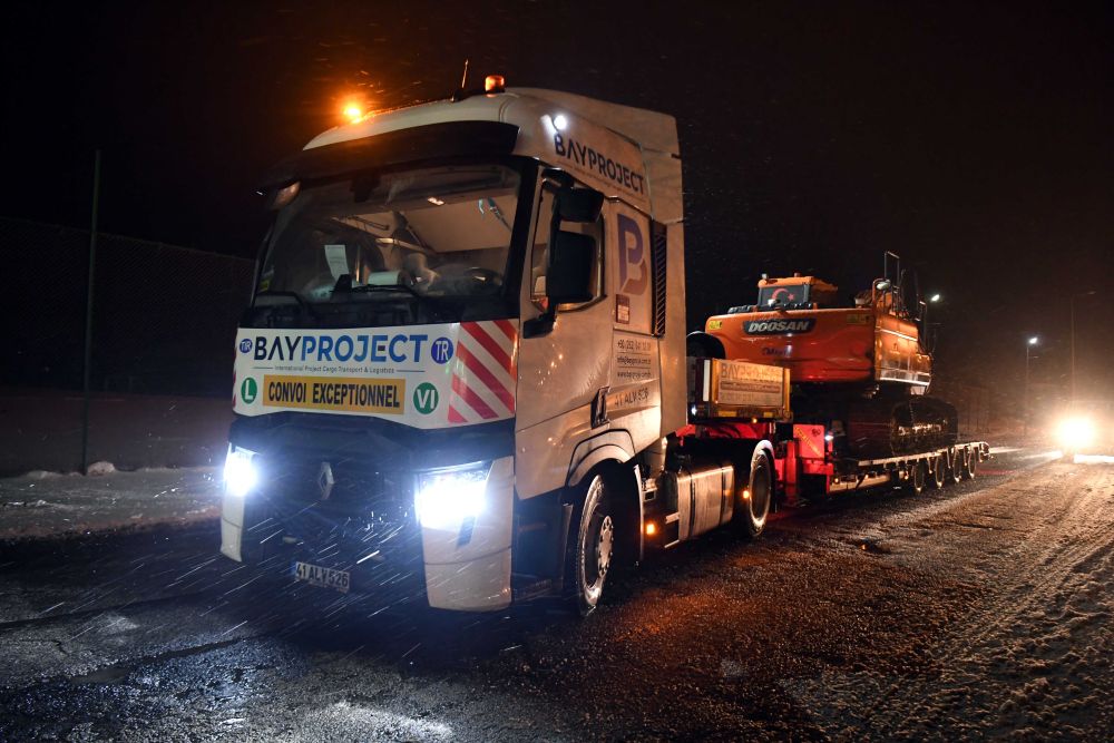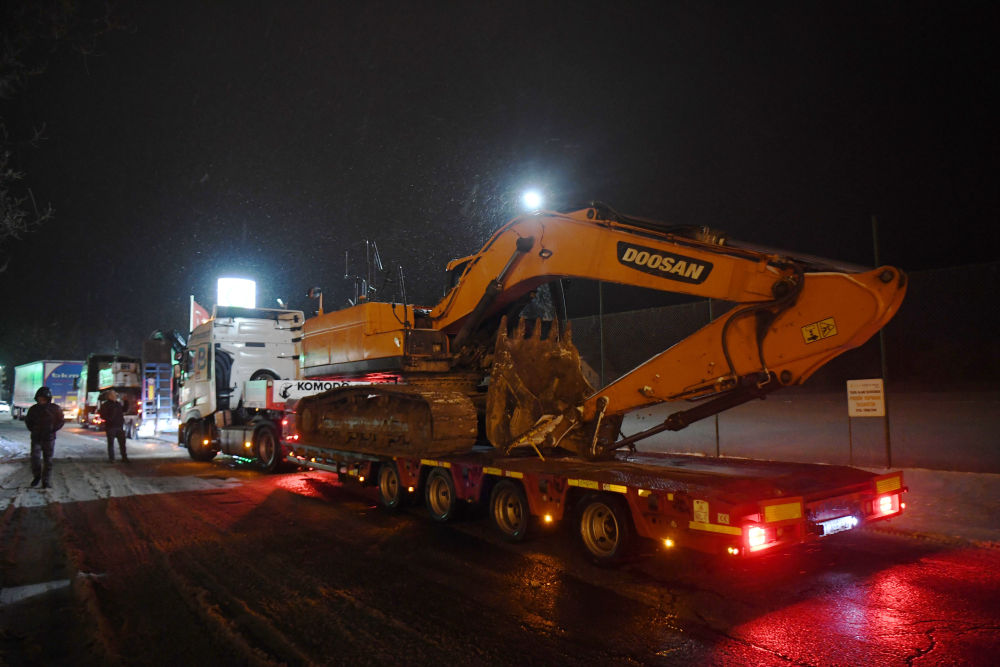 2月6日晚在土耳其伊斯坦布爾至安卡拉公路上拍攝的運往災區的大型機械。