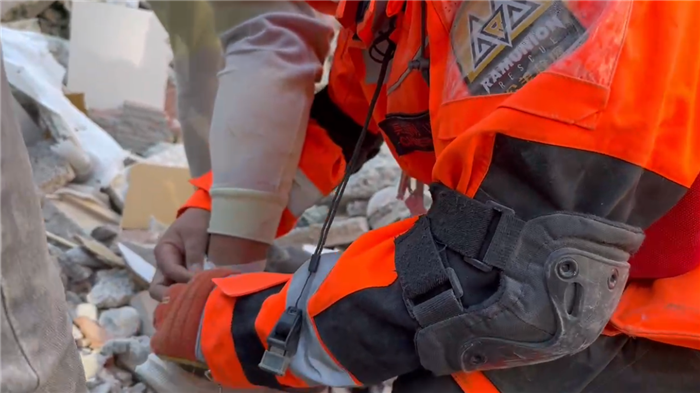 公羊救援隊隊員為土耳其作業人員現場進行簡易包扎。視頻截圖