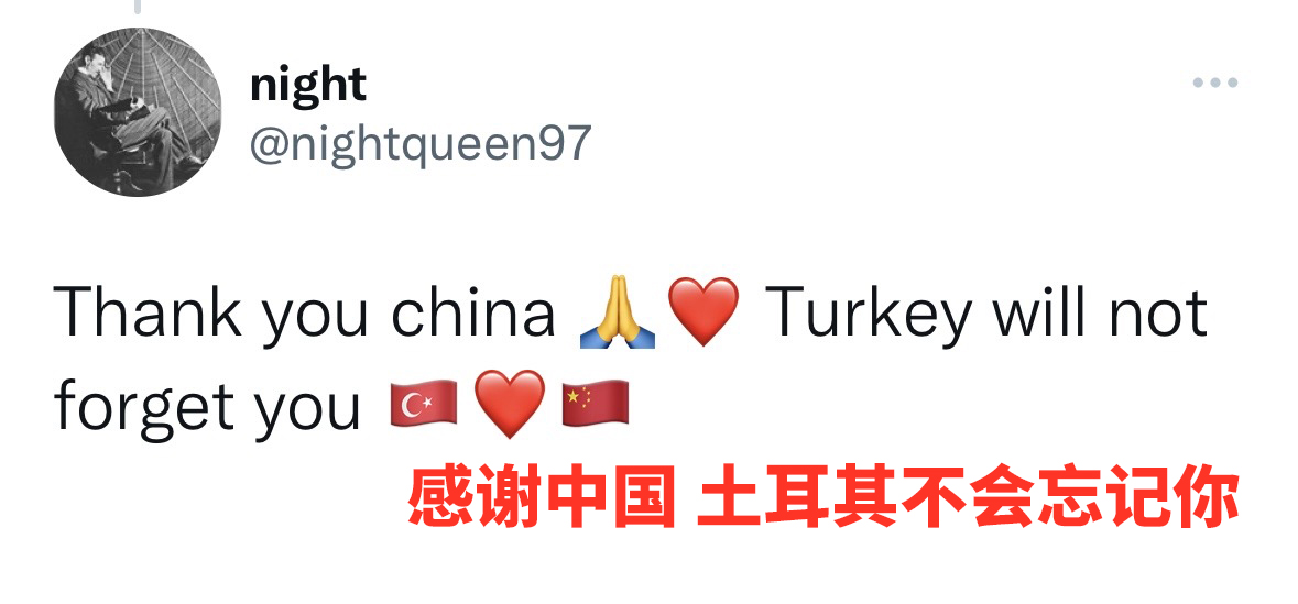2月6日,土耳其發生兩次7.8級地震,中國政府和社會力量隨即對土耳其進行緊急援助,充分體現了中國人民的國際人道主義精神和大愛無疆的情懷,以及中國人民對土耳其人民的友好情誼。