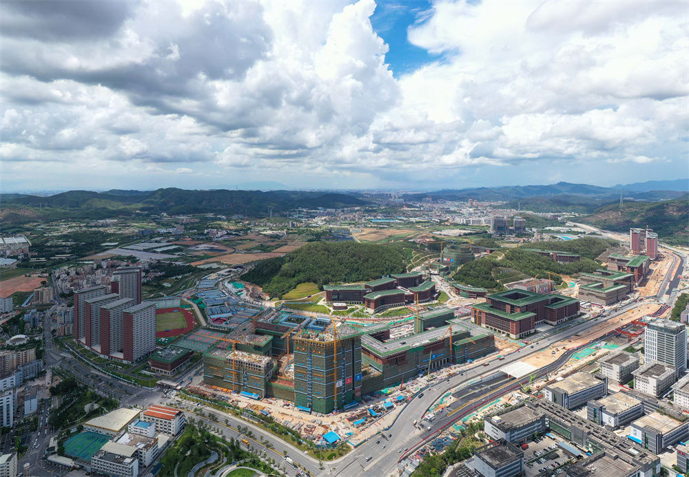 這是2021年5月26日拍攝的中山大學深圳校區“中大城”已經啟用的一期西園和二期建設現場(無人機照片)。廣深科技創新走廊“中大城”是集科研、創新、生態于一體的區域教育高地、醫療高地和創新高地,以生物醫藥產業、新一代信息技術產業和先進制造業為主導產業。