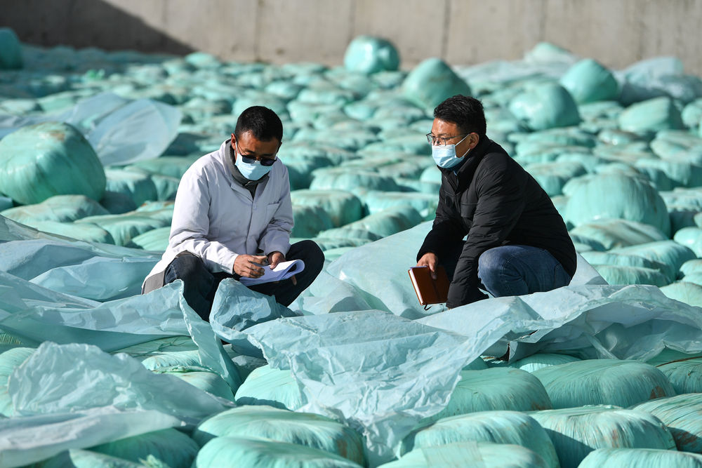 2月14日,扎西江村(右)在隆子縣聶雄標準化奶牛養殖基地查看牛飼料,調研當地產業發展問題。新華社記者晉美多吉 攝