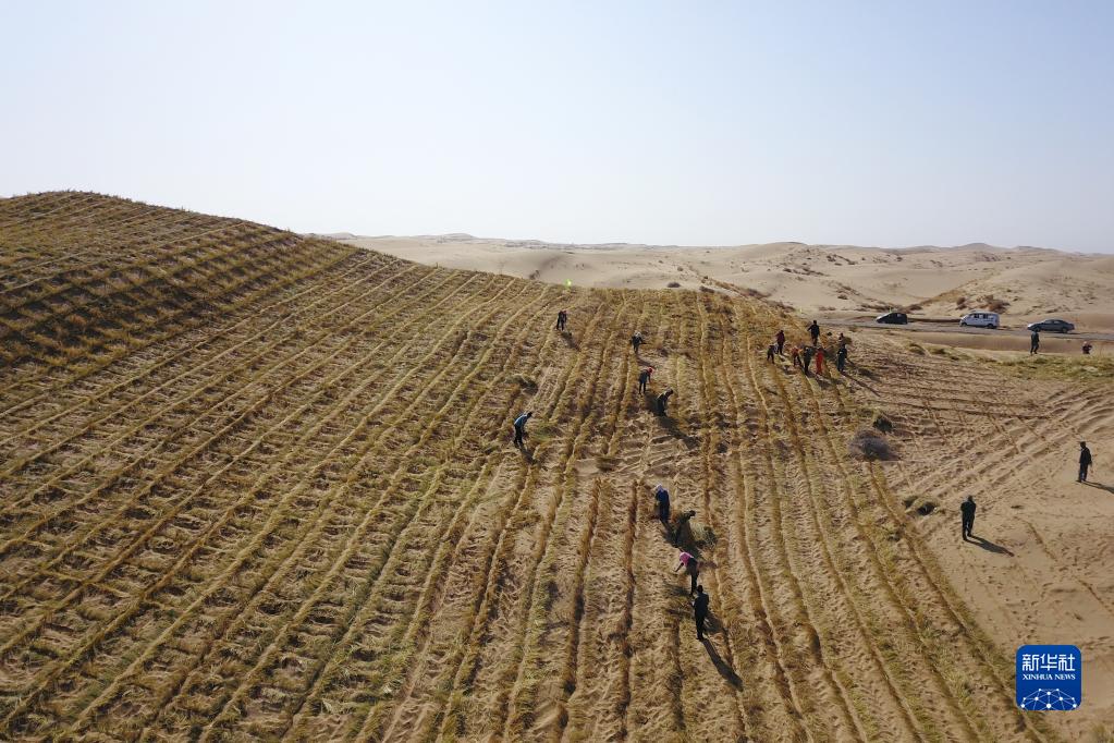 在甘肅省武威市古浪縣北部沙區旱麻崗治沙點,八步沙林場治沙人和群眾一起扎草方格壓沙(2020年3月6日攝,無人機照片)。新華社記者 范培珅 攝