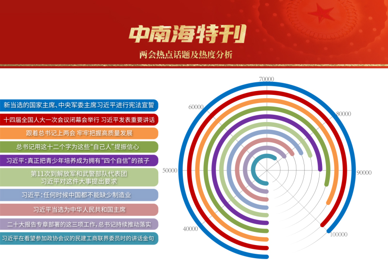 3月,世界目光,聚焦北京。近3000名中外記者采訪報道全國兩會。央視網“智聞”系統提取分析兩會期間全網時政新聞熱點顯示,習近平總書記的兩會關切吸引全網目光,新征程領路人的人民情懷成為網友“兩會印象”最深刻的主題之一。