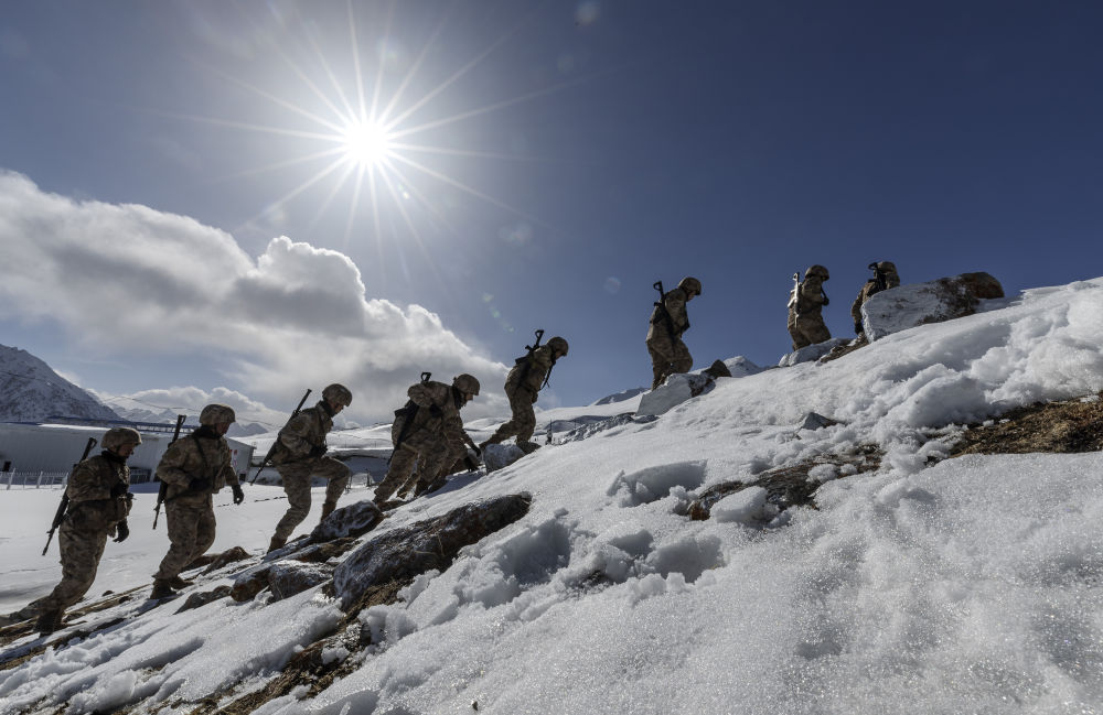 位于帕米爾高原的新疆軍區某邊防團紅其拉甫邊防連的戰士在巡邏(2023年4月13日攝)。新華社記者 費茂華 攝