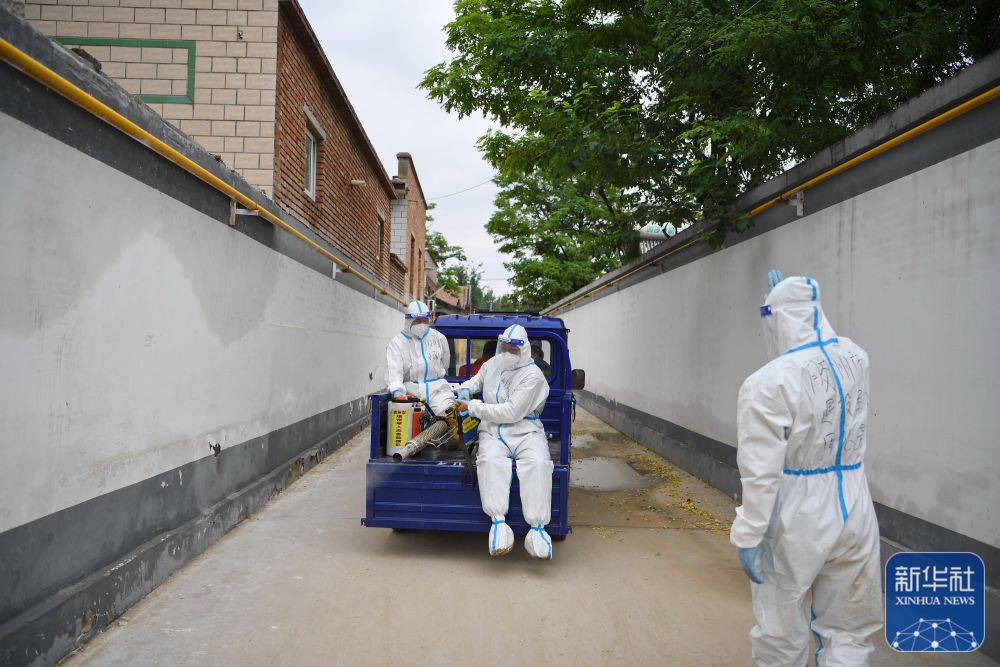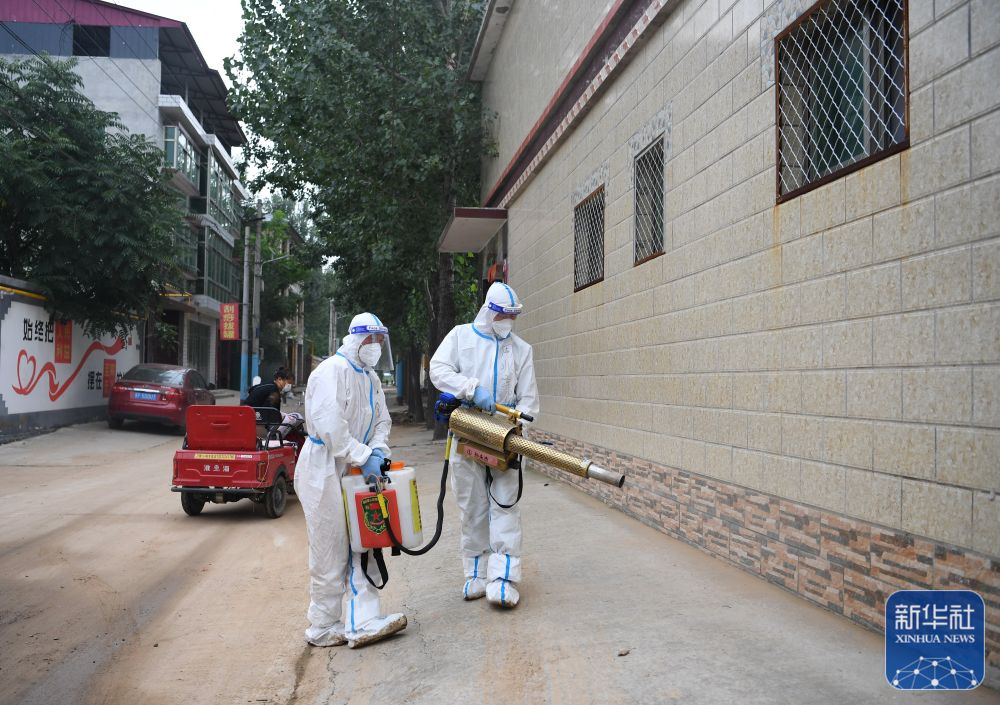 ↑8月6日,在河北省涿州市刁窩鎮白塔村,志愿者在民房前進行消殺作業。