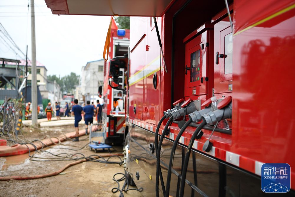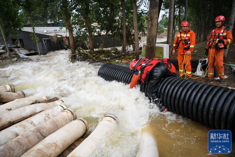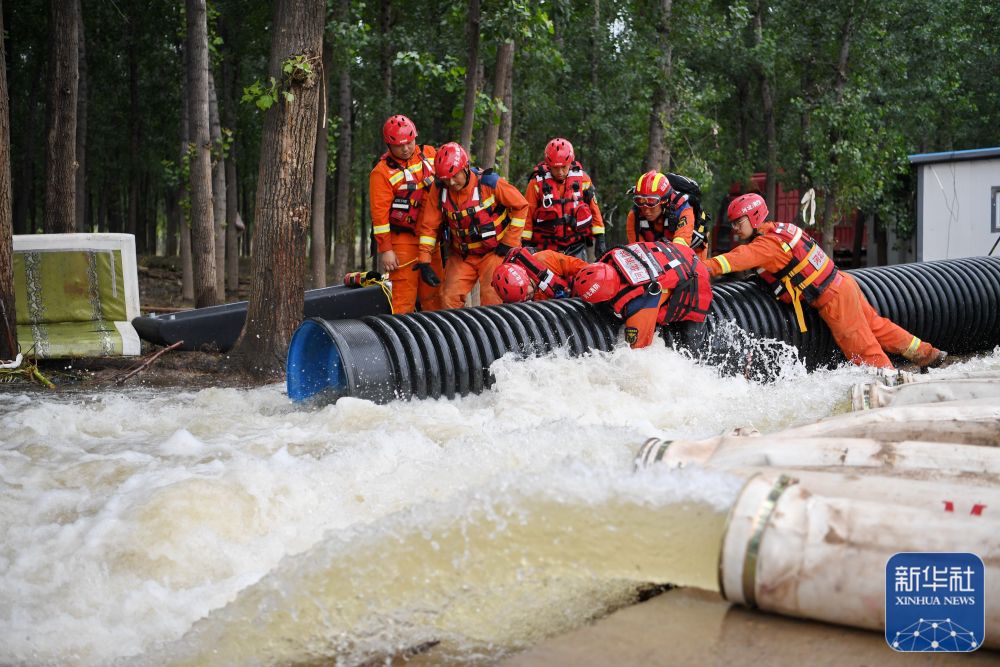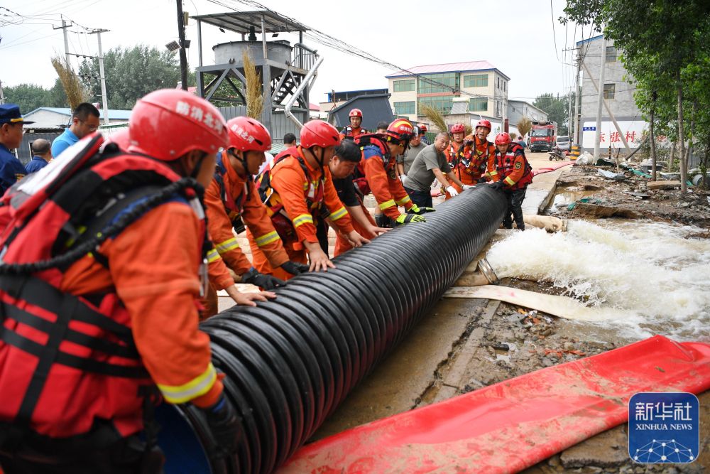 ↑8月6日,在河北省涿州市刁窩鎮東張村,唐山消防救援支隊隊員在進行排澇作業。