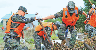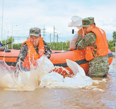 8月5日,黑龍江省哈爾濱市道外區人武部民兵應急分隊在團結鎮勤勞村展開救援。 呂衍海攝(新華社發)