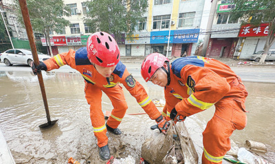 8月5日,河北省涿州市,唐山市消防救援支隊隊員在清理淤泥和雜物。 倪 弋 郭世東攝影報道