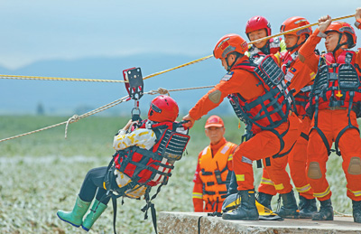 8月5日,吉林省舒蘭市七里鄉三合村,吉林市森林消防支隊隊員在利用繩索救援受困群眾。 孟海鷹 薛二濤攝影報道