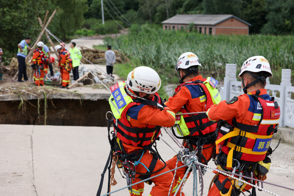 8月6日,吉林市消防救援支隊隊員利用繩橋解救受困村民。新華社記者 顏麟蘊 攝 防汛救災一線,國家綜合性消防救援隊伍紛紛成立臨時黨組織,組建黨員突擊隊,設立黨員先鋒崗、示范區。堤壩上、舟艇里,凝聚起抗洪搶險的強大合力。 ——跨區增援,彰顯履職能力。 8月2日22時35分許,山東省消防救援總隊7個支隊、87輛消防車、519名消防救援人員,全部到達河北集結點并投入搶險救災戰斗。從接令增援到投入戰斗,僅用8個小時。 高效增援背后是消防救援隊伍不斷增強的履職能力。防汛救災一線,國家消防救援局不斷優化改進執勤備戰模式:調派的水域救援專業隊均配有救生拋投器、水上救生機器人等水域救援裝備;調配宿營車、炊事車、淋浴車、盥洗車、被服洗滌車、發電照明車等,保障消防救援人員“三熱一干”基本生活需要…… 入汛以來,國家綜合性消防救援隊伍已累計投入4.2萬余人、車輛舟艇1.98萬余輛(艘),營救疏散群眾超3.02萬人。 災情來臨,義無反顧;災后重建,勇挑重擔。 積水排澇、防疫消殺……洪水漸退,長春市消防救援支隊馬不停蹄轉戰參與災后重建。 吉林榆樹市拉林河流域多個村莊積水嚴重,支隊消防員跳進齊肩的積水中,調整抽水泵位置,尋找最佳排水點;在消殺陣地,他們又頂著炎熱天氣,對多個村莊進行挨家挨戶消殺。