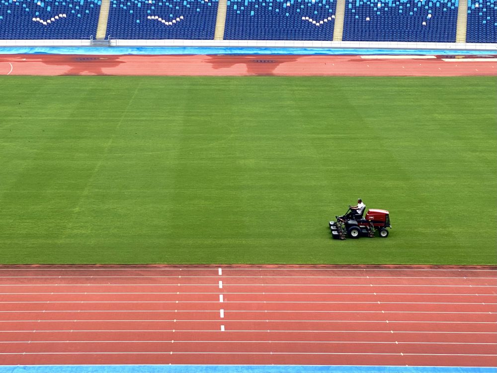 圖為工作人員在溫州奧體中心體育場維護草坪。新華社記者魏一駿 攝