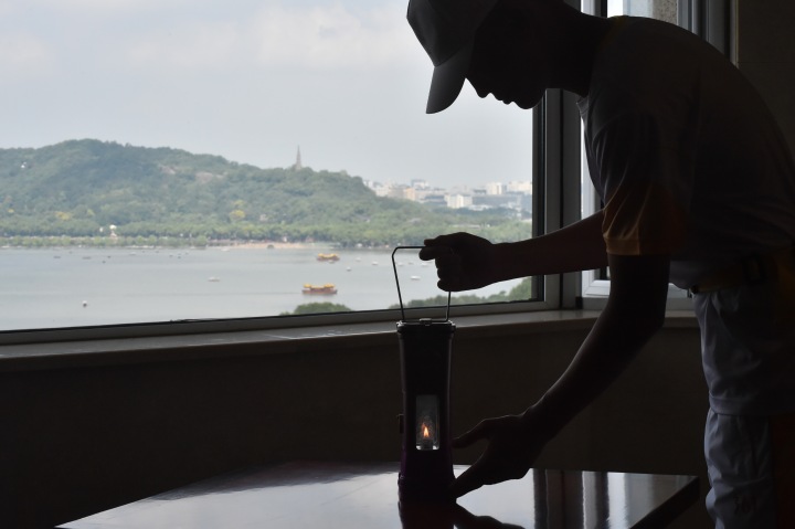 火種燈抵達西湖邊,靜候火炬傳遞啟動。