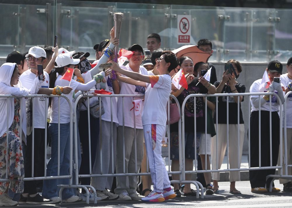 ↑火炬手屠紅燕在火炬傳遞后與觀眾互動。