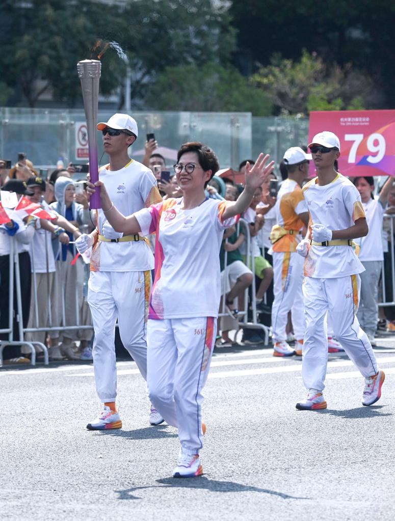 9月11日,火炬手屠紅燕在火炬傳遞中。當日,杭州亞運會火炬在浙江省紹興傳遞。新華社記者徐昱 攝