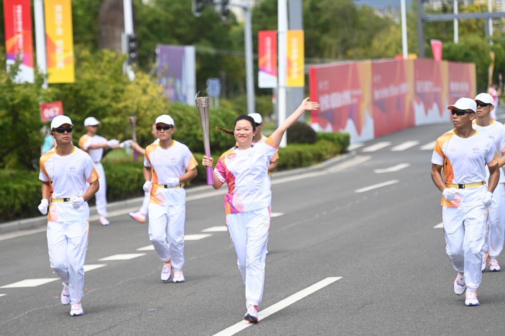 9月12日,火炬手趙晶在火炬傳遞中。當日,杭州亞運會火炬在浙江省寧波傳遞。新華社記者黃宗治攝