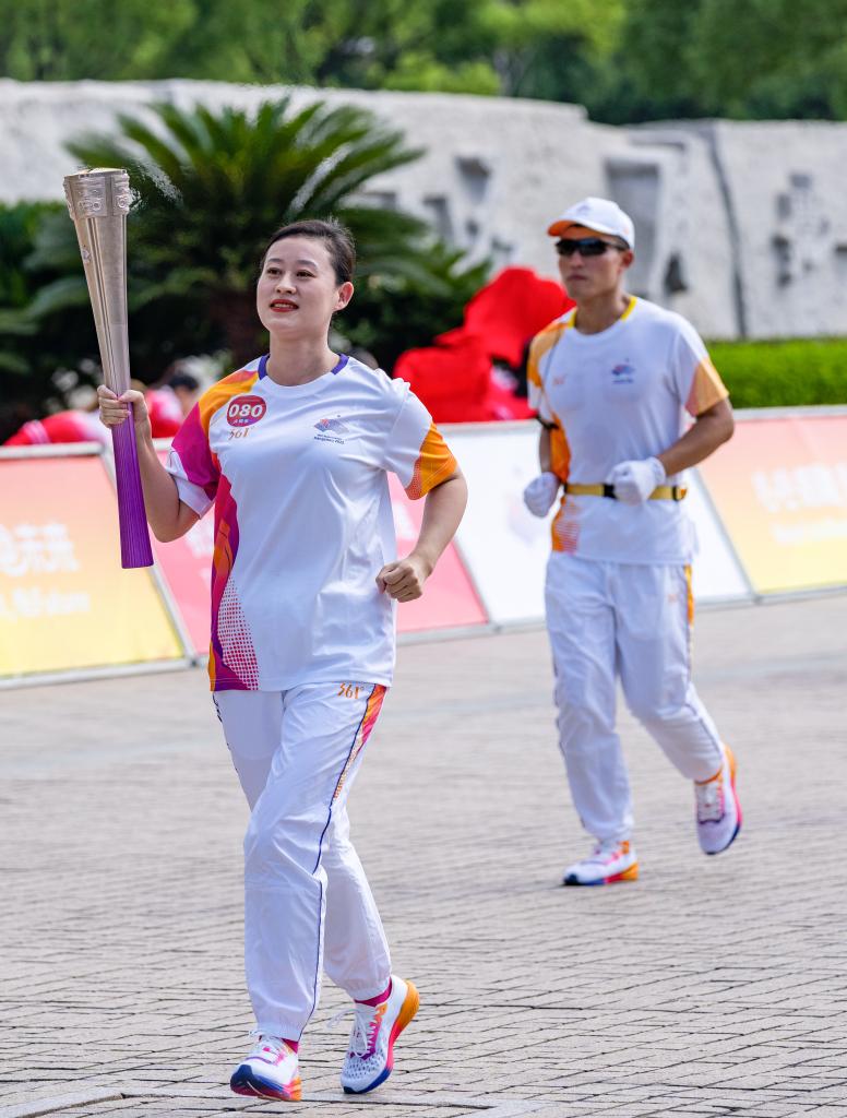 9月10日,火炬手袁晶在火炬傳遞中。當日,杭州亞運會火炬在浙江省嘉興傳遞。新華社記者孫非攝