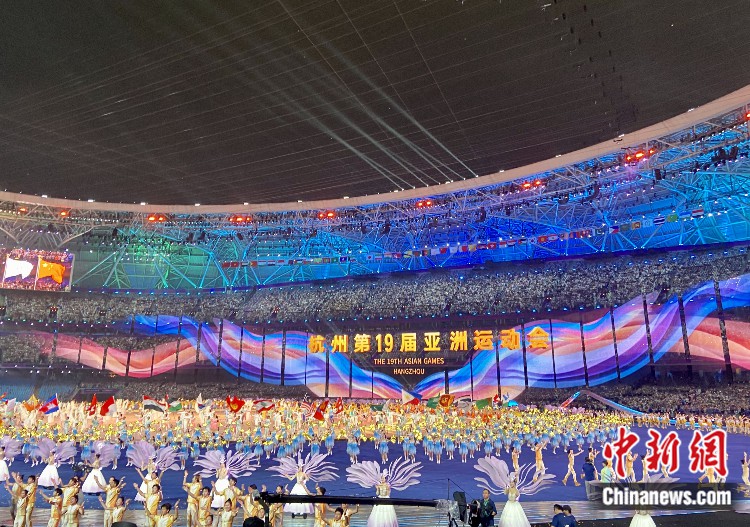 中新社杭州9月24日電 (方堃 項菁)看得見數字煙花、聽得見錢江潮水、聞得到桂花香氣……23日晚,錢塘江兩岸燈光照耀古今,杭州第19屆亞運會開幕式多項環節“刷新”亞運史。