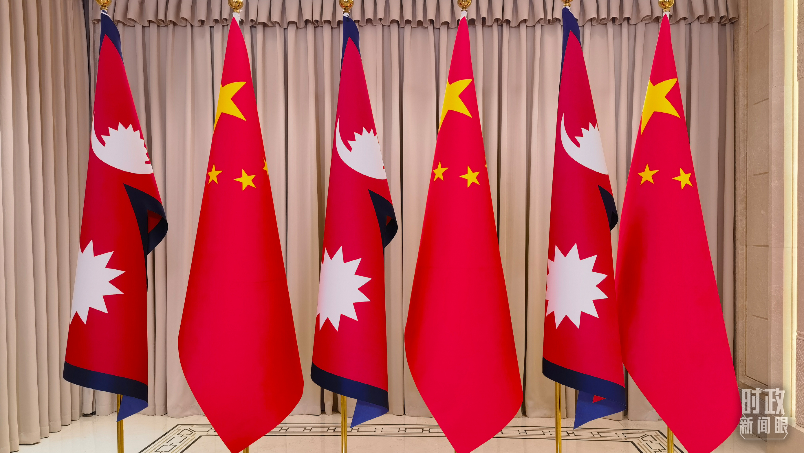 △會見現場擺放的中國、尼泊爾國旗。(總臺央視記者周志國 拍攝)