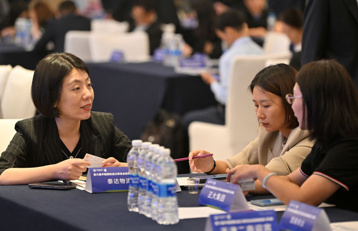 在第六屆中國國際進口博覽會招商路演(天津)活動現場,參展商代表和天津的采購商代表進行交流(2023年9月26日攝)。新華社記者 李然 攝