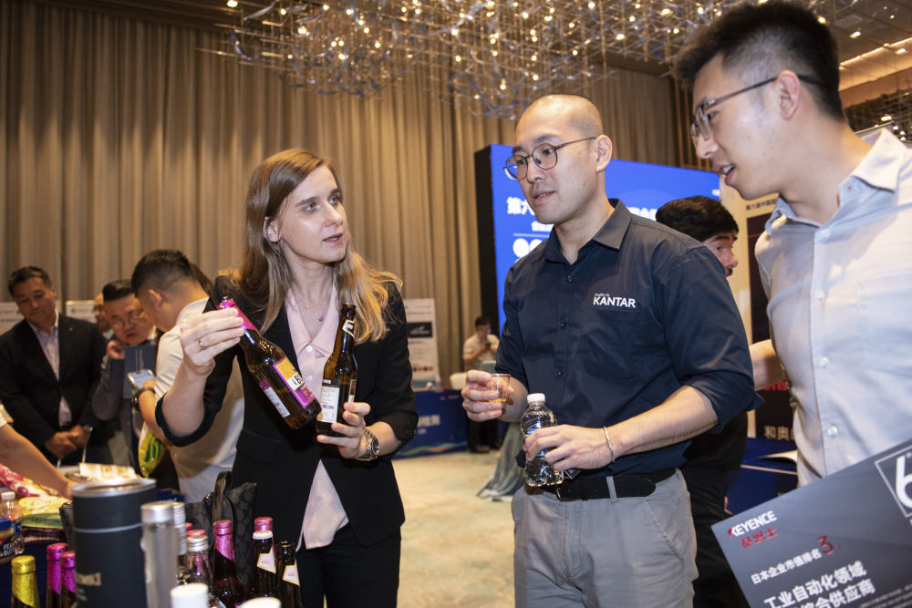 在深圳舉行的進博會展前供需對接活動上,波蘭投資貿易局的工作人員(左前)向采購商展示風味啤酒(2023年8月29日攝)。新華社記者 毛思倩 攝