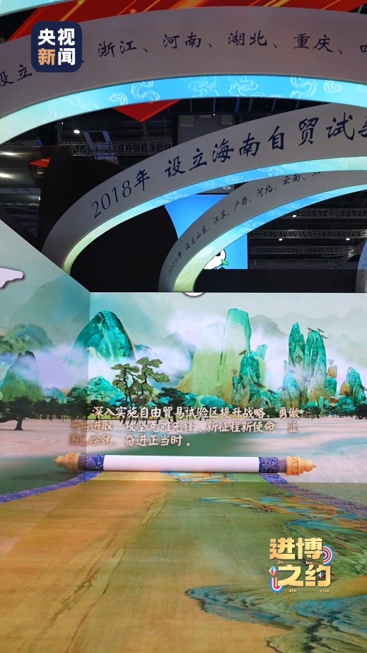 在今年進博會上 中國館專門設立了 “自貿試驗區建設十周年成就展” 一條采用了傳統水墨畫風格的時光隧道 全景呈現自貿區十年的建設歷程