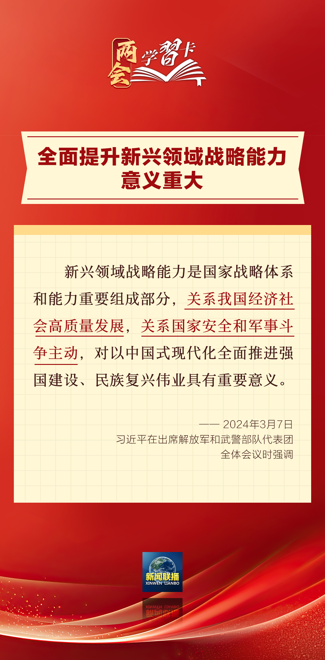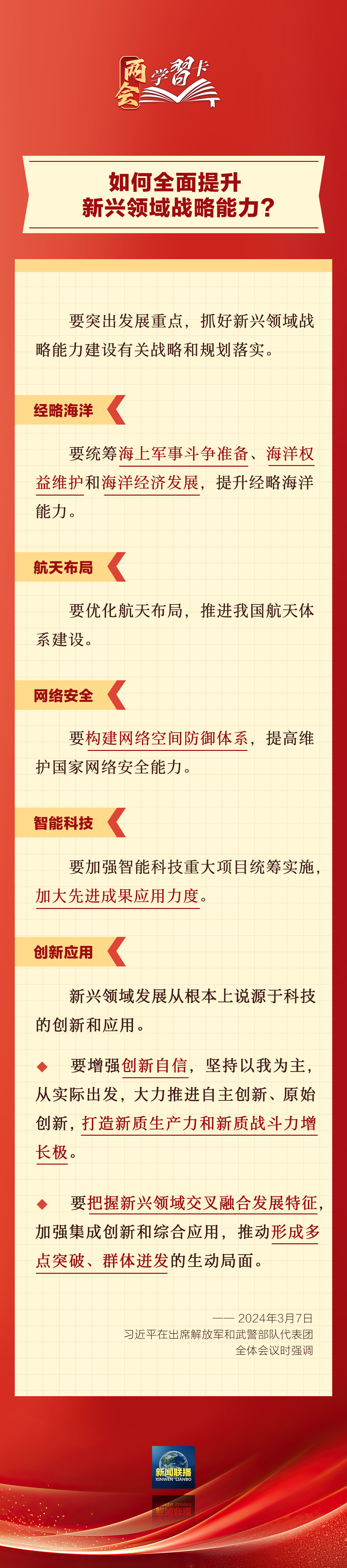 3月7日,習近平在出席解放軍和武警部隊代表團全體會議時強調,強化使命擔當,深化改革創新,全面提升新興領域戰略能力。如何提升新興領域戰略能力?一起學習↓↓↓