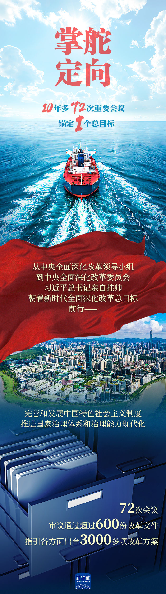 10年多來,這樣的會議,習近平總書記主持召開了72次??傮w設計、統籌協調、整體推進、督促落實,習近平總書記掌舵領航,中國改革航船沿著正確航線向更深水域、更廣天地前進。