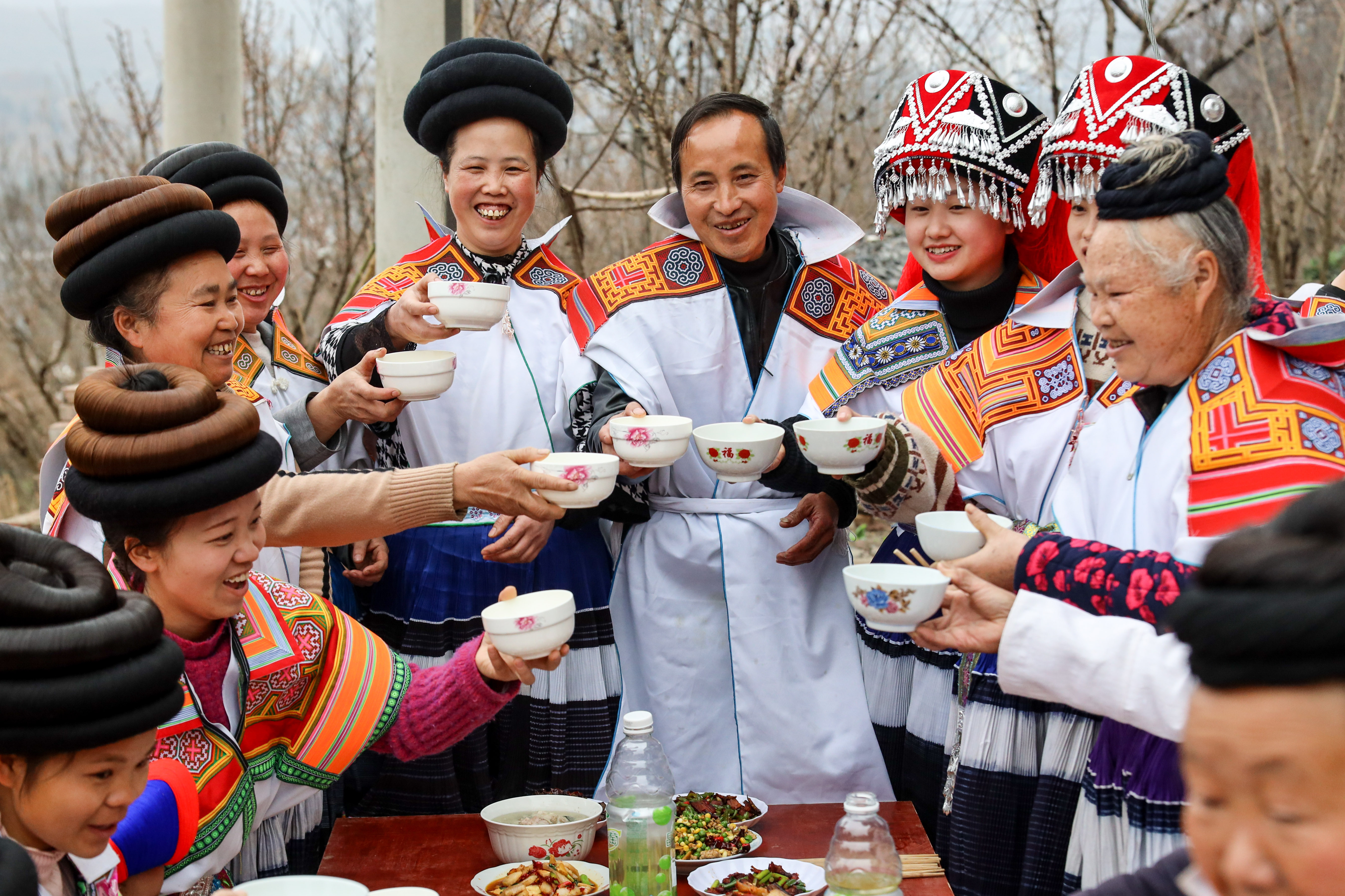 在位于烏蒙山區腹地的貴州省畢節市納雍縣,村民馬雍(右五)與妻子黃國琴(左五)在年夜飯上與大家干杯(2021年2月11日攝)。新華社記者 歐東衢 攝