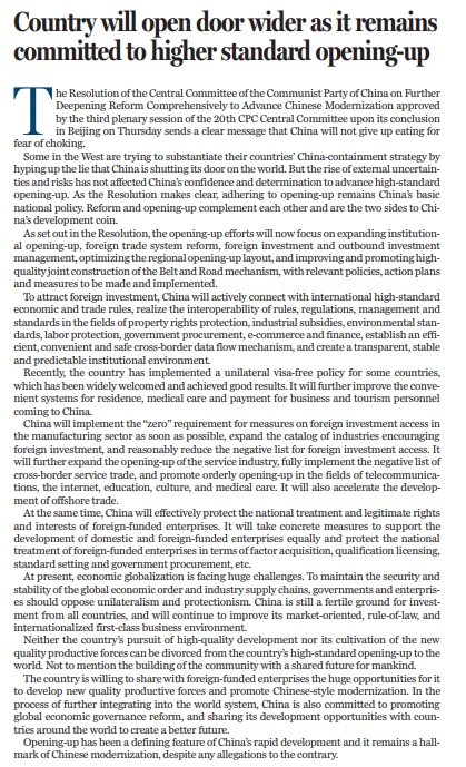 一段時間以來,一些西方勢力熱衷于炒作中國要對世界“關上大門”,借這種謊言來推行其遏制中國的戰略。但不確定性以及風險的增多,并不能動搖中國繼續深化改革、擴大開放的堅定決心和信心?!稕Q定》明確指出,必須堅持對外開放基本國策。 改革與開放相輔相成、相互促進,也是中國發展的兩大主題。 《決定》指出,完善高水平對外開放體制機制將聚焦于穩步擴大制度型開放、深化外貿體制改革、深化外商投資和對外投資管理體制改革、優化區域開放布局、完善推進高質量共建“一帶一路”機制幾大方面。預計相關政策、行動方案以及措施未來也將持續出臺實施。 為進一步吸引外資,中國將主動對接國際高標準經貿規則,在產權保護、產業補貼、環境標準、勞動保護、政府采購、電子商務、金融領域等實現規則、規制、管理、標準相通相容,建立高效便利安全的數據跨境流動機制,打造透明、穩定、可預期的制度環境。 近期,中國對多國實施的單方面免簽政策受到了廣泛的歡迎,也收獲了積極的成果。未來,中國還將進一步完善來華經商旅游人員居住、醫療、支付等便利制度。 中國將盡快落實制造業領域外資準入限制措施“清零”要求,擴大鼓勵外商投資產業目錄,合理縮減外資準入負面清單。擴大服務業開放,全面實施跨境服務貿易負面清單,推動電信、互聯網、教育、文化、醫療等領域有序擴大開放。加快推進離岸貿易發展。 與此同時,中國還將切實保障外資企業國民待遇和合法權益,一視同仁支持內外資企業發展,保障外資企業在要素獲取、資質許可、標準制定、政府采購等方面的國民待遇。 當前,經濟全球化面臨巨大挑戰,反對單邊主義、保護主義,維護全球經濟秩序和產業鏈、供應鏈的安全穩定,是各國政府和企業共同的責任。中國依然是各國投資的沃土,也將不斷完善市場化、法治化、國際化一流營商環境。 中國的對外開放,對自身,對全球都意義重大。無論是實現自身的高質量發展,還是培育新質生產力,都離不開高水平的對外開放,對構建人類命運共同體也是如此。 中國愿同廣大外資企業分享中國發展新質生產力、推進中國式現代化蘊藏的巨大機遇。在進一步融入世界體系的進程中,中國也致力于推動實現全球經濟治理改革,與世界各國共享發展機遇,共創美好未來。 對外開放是中國高速發展的決定性特征,也是中國式現代化的鮮明標識。中國開放的大門只會越來越大,任何對中國對外開放的質疑終將站不住腳,而中國推動更高水平開放、建設開放型世界經濟和構建人類命運共同體的步伐也一定不會停滯。