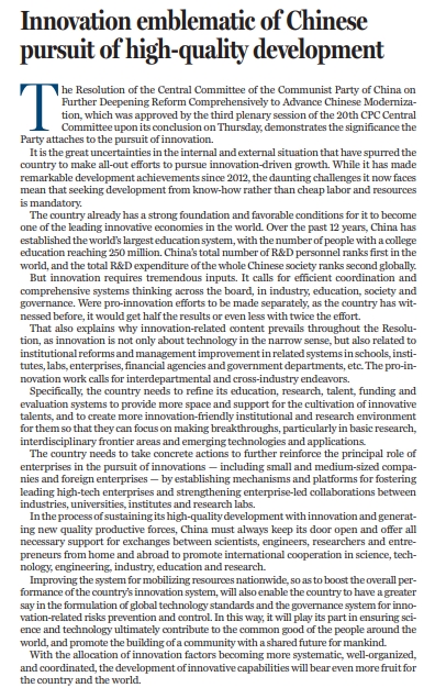 7月18日,中國共產黨第二十屆中央委員會第三次全體會議在北京勝利閉幕,全會審議通過了《中共中央關于進一步全面深化改革、推進中國式現代化的決定》(以下簡稱《決定》),其中的相關內容展現了黨對持續推進創新的重視與決心。