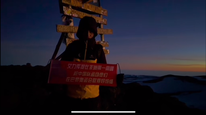 艾力庫提·地里夏提登上乞力馬扎羅山并祝福中國奧運健兒。圖源:艾力庫提個人社交平臺
