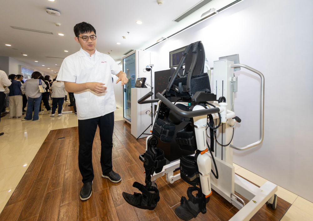 2024年5月24日,在位于上海市嘉定區的上海交通大學醫學院附屬瑞金醫院腫瘤質子中心,工作人員介紹由瑞金醫院醫生和醫療公司共同研發的用于恢復患者下肢的醫療機器人。新華社記者 王翔 攝