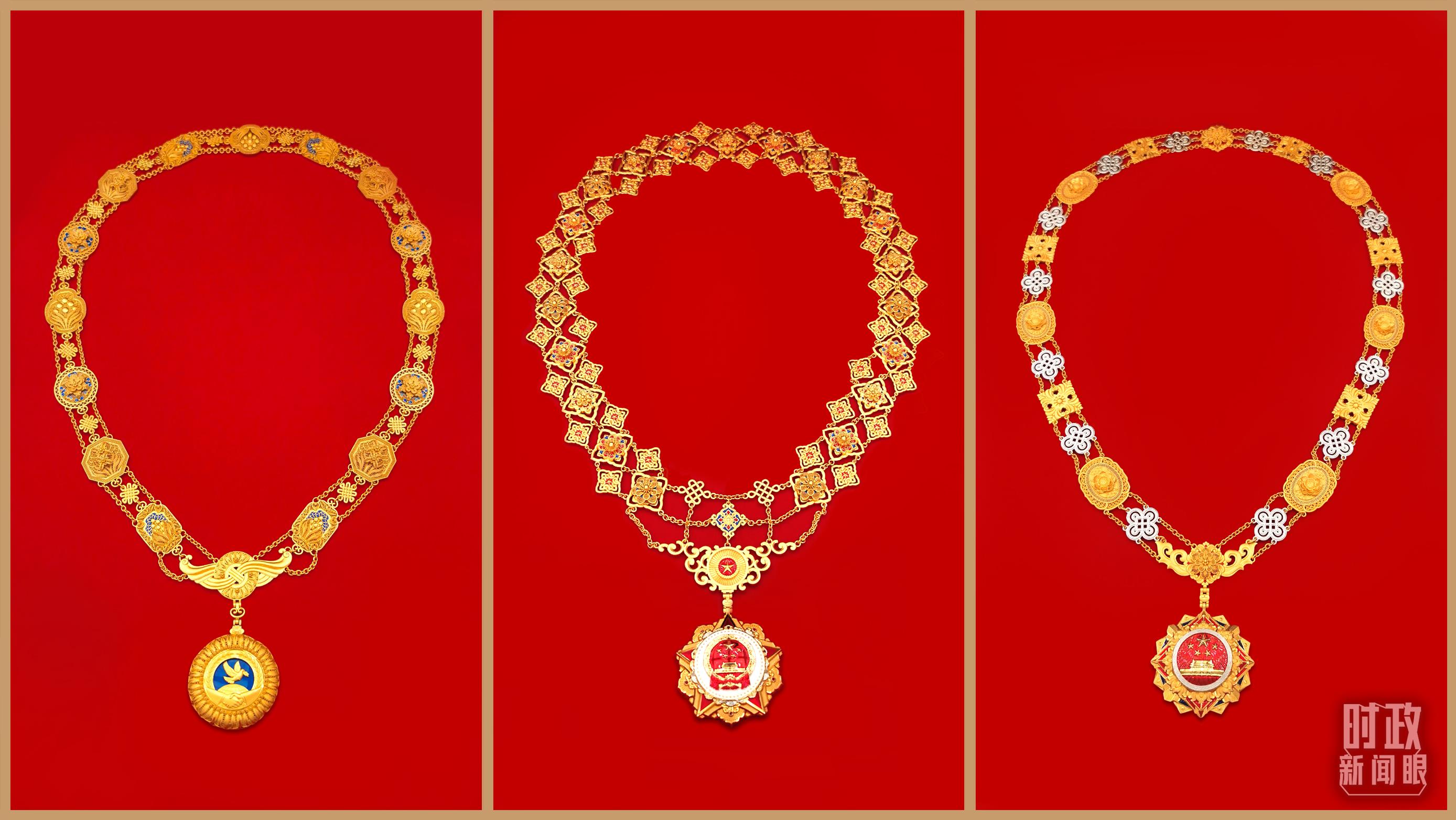 △“共和國勛章”(中)、“友誼勛章”(左)和國家榮譽稱號獎章(右)。(總臺央視記者郭鴻、鄂介甫拍攝)